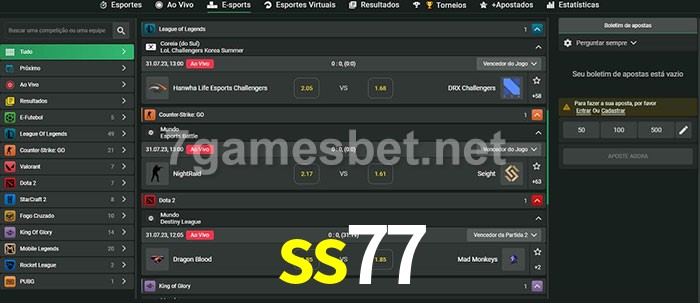 O ss77 oferece uma grande seleção de opções de apostas em e-sports com probabilidades competitivas
